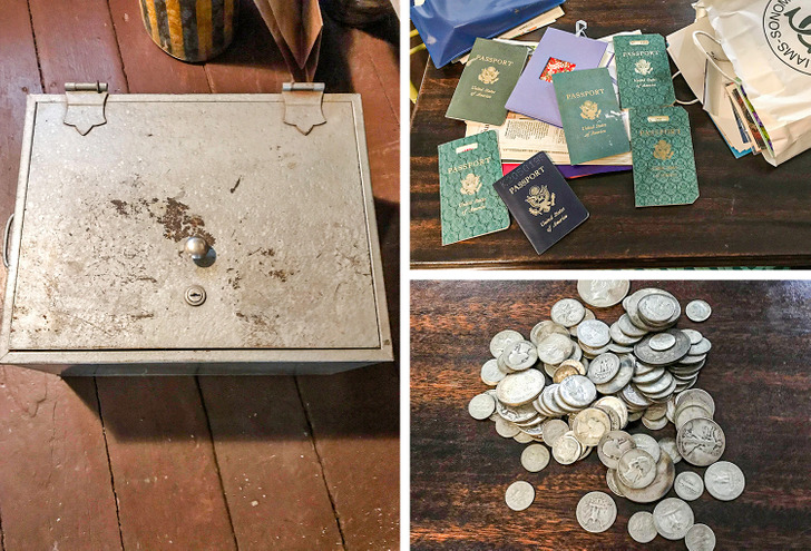 A kulcsot nem találtuk, úgyhogy szétfúrtam a zárat. Ezüst pénzeket és egy csomó útlevelet rejtett, mind az 1920-as évekből.