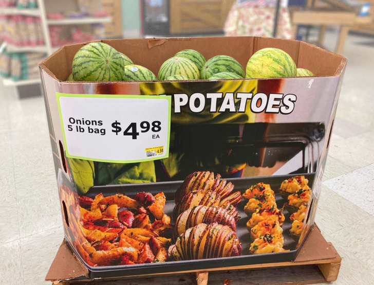 „Burgonyák” felirat áll a dobozon, „hagymák” a matricán.. és dinnyék vannak benne.
