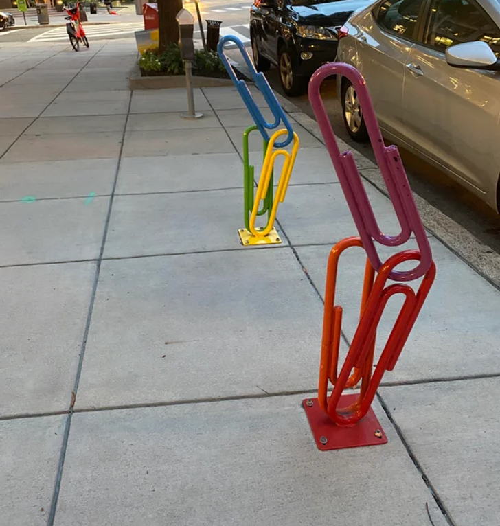 Gemkapcsok inspirálta kerékpárállványok egy iskola előtt