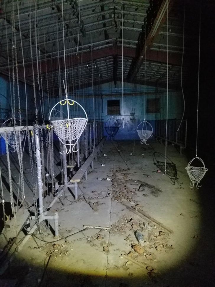 Bányászok öltözője. A kosarakba helyezték a váltóruhájukat, majd felhúzták azokat a mennyezetig
