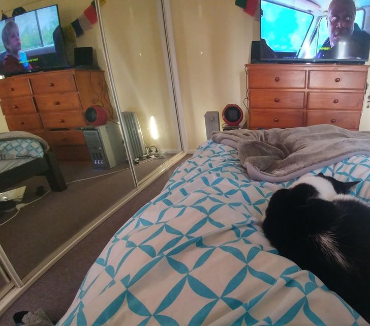 A tükörben és a tévében más-más jelenet látható..